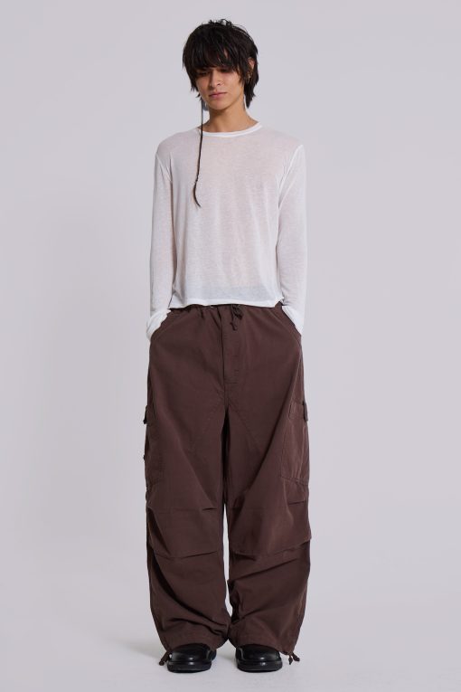 DescriptionDesigned with an oversized fit and a combination of metal eyelets, zip fly and adjustable cotton drawcord, our Brown Parachute Cargo Pants deliver refined luxury and ultimate comfort. Details such as a pleated knee and inside leg darts ensure a perfect fit, while a six-pocket styling and a unique airpod pocket provide functional convenience. Elevate any look with this timeless and classic silhouette.