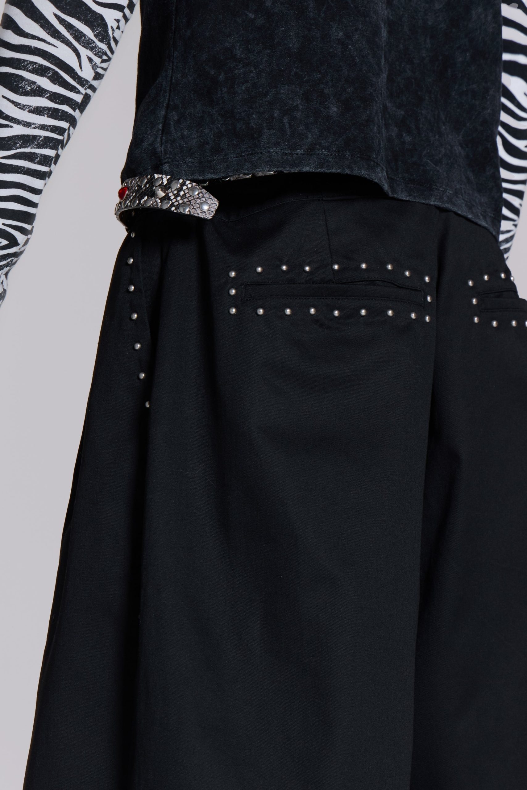 - Antique silver stud detailing at pockets