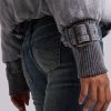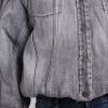 Grey wash denim bomber jacket with oversized fur collar and rib cuffs with belt detail.