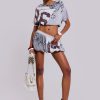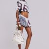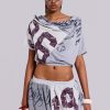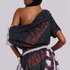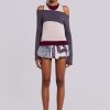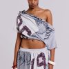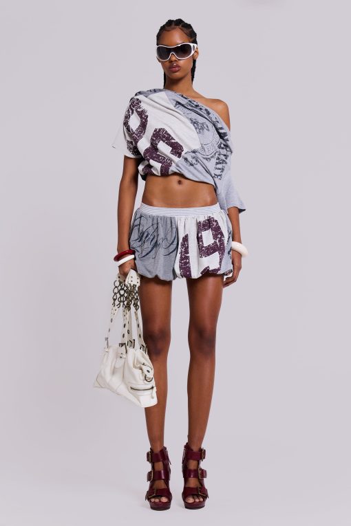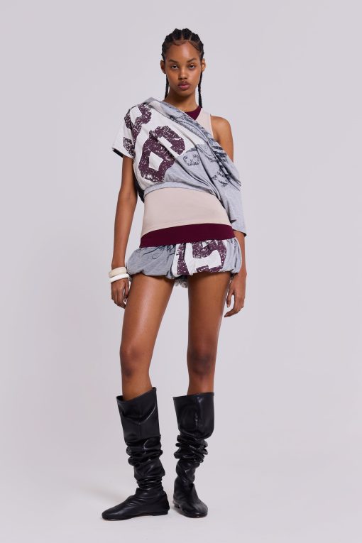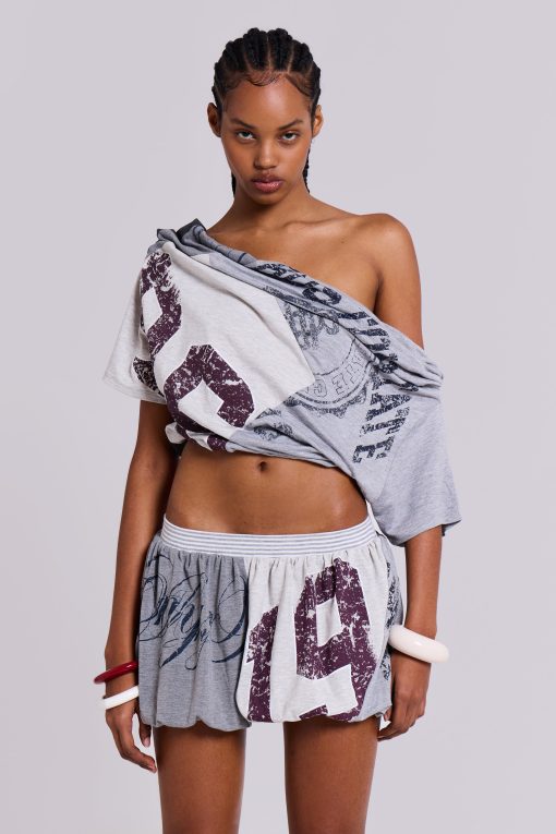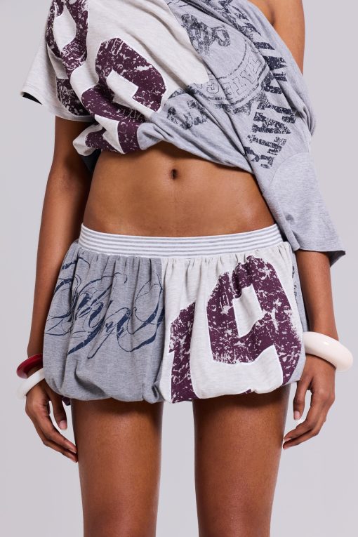 April Reworked Puffball Skirt. Reworked deconstructed puffball skirt with varying varsity artworks and stripe waistband.