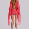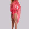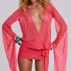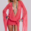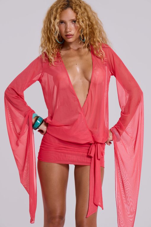 Aria Mesh Plunge Mini Dress. Coral mesh mini dress with fitted skirt, open back, draped plunge body and dramatic extra long flared sleeves, and a detail at waist seam. Fastens with tie at back.