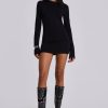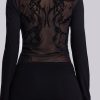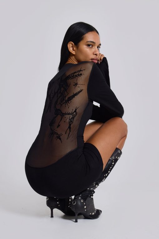 The Black Wings Mesh Dress is an exclusive piece designed with long fluted sleeves, a mini length silhouette and a back featuring a contrast of mesh and flock design artwork from ‘Lazy Willy’. This mini-length dress is complete with a crew neckline.