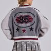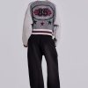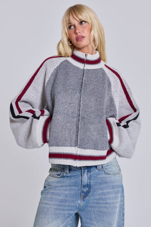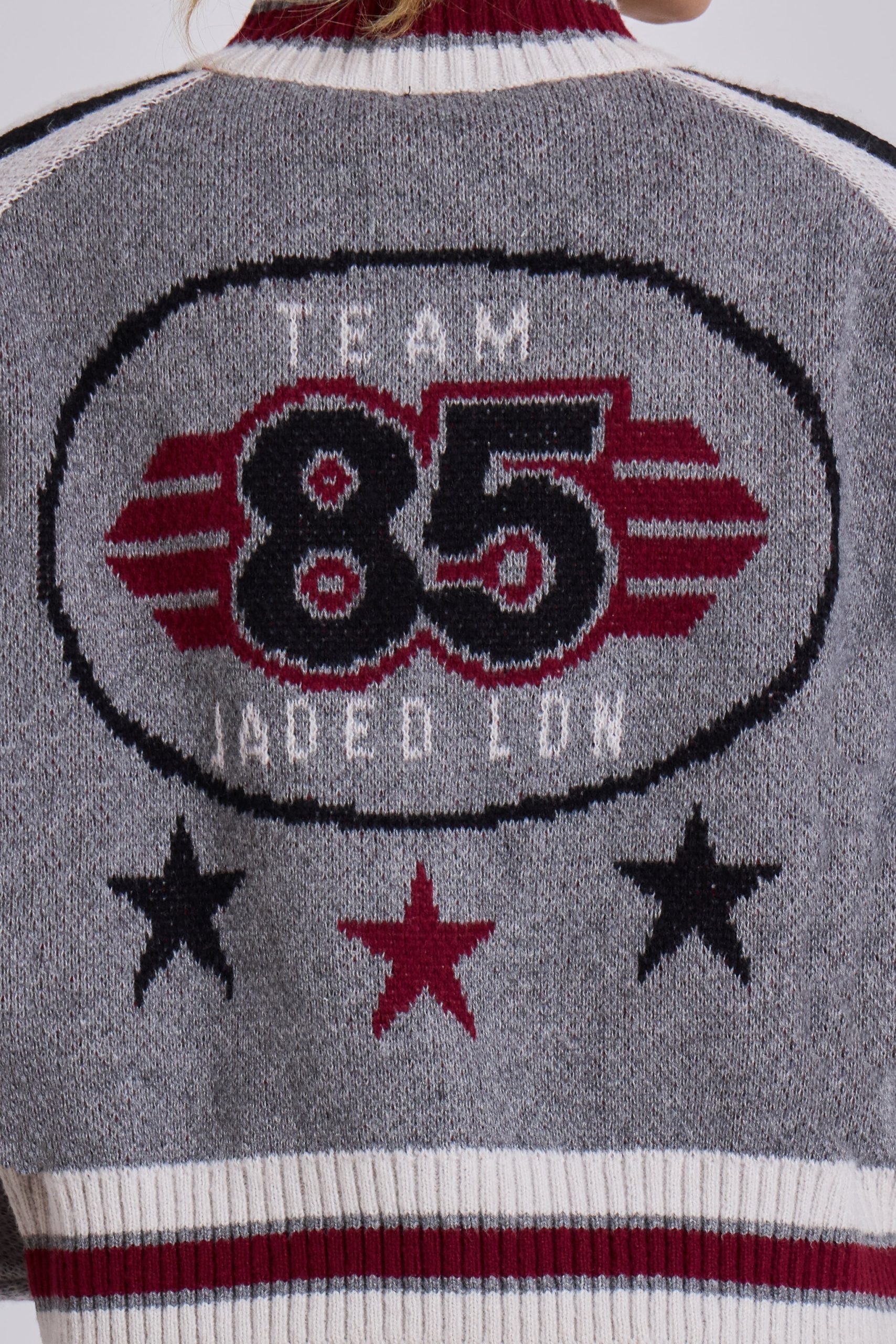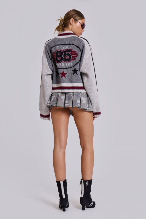 Team 85 Knitted Bomber Jacket. Team Jaded Knitted Zip Through bomber in a heavyweight chunky knit fabric and an oversized cropped fit. This jacket features a funnel neck collar with patch front pocket detailing.