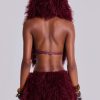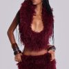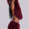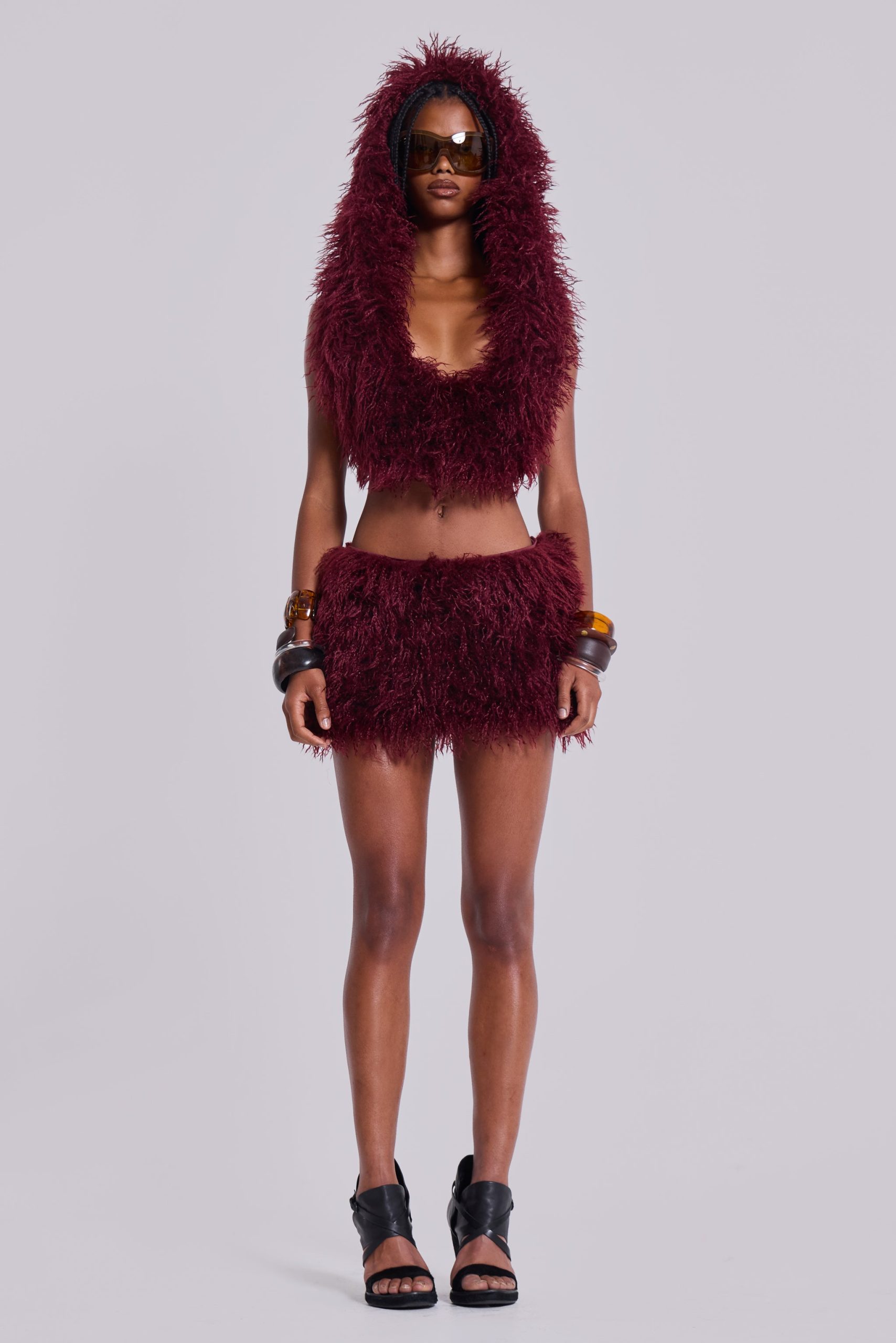 Haka Mongolian Faux Fur Backless Top. Hooded backless plunge Mongolian faux fur top in burgundy. Fastens with PU leather back strap.
