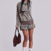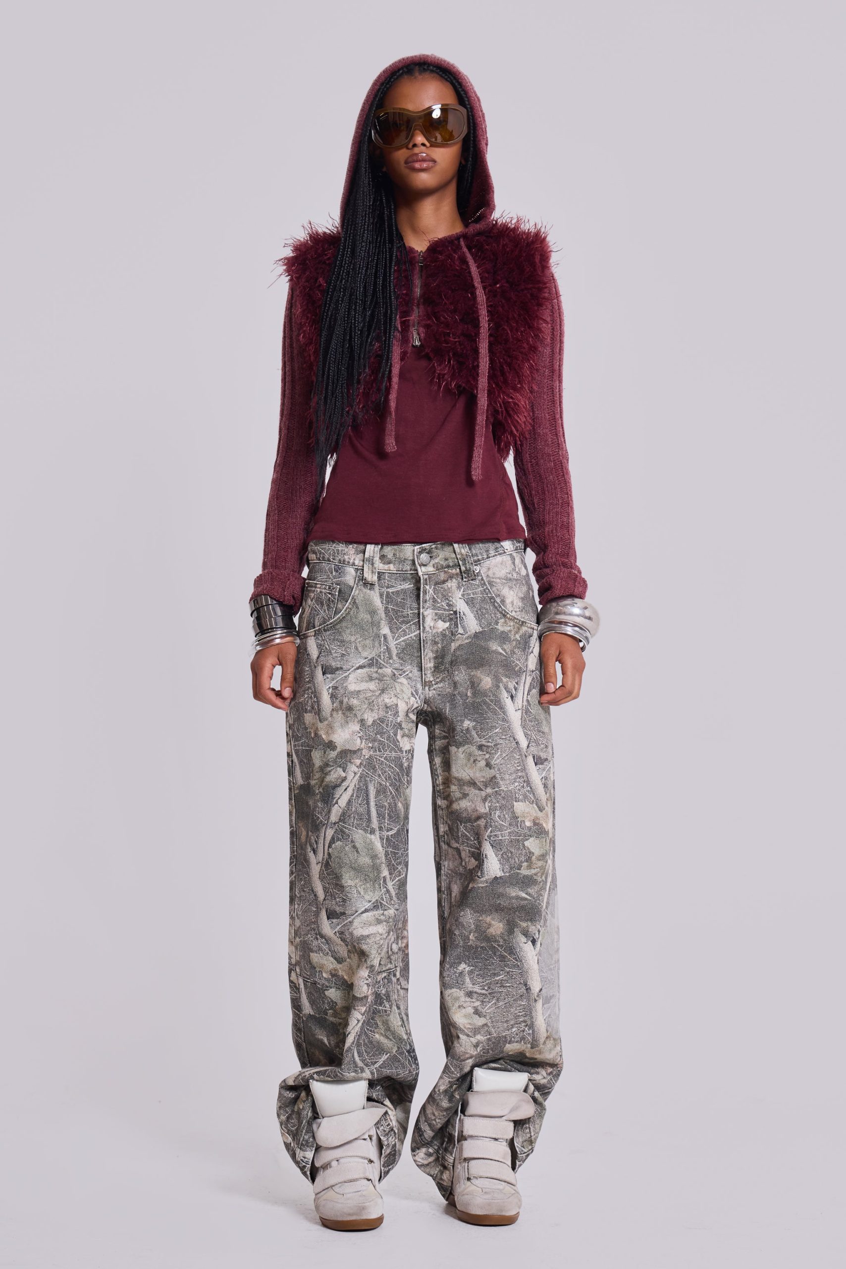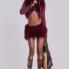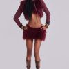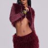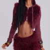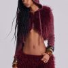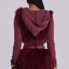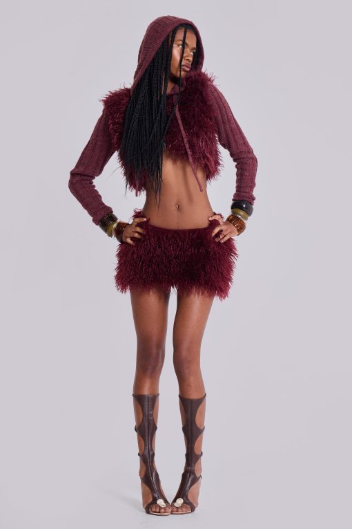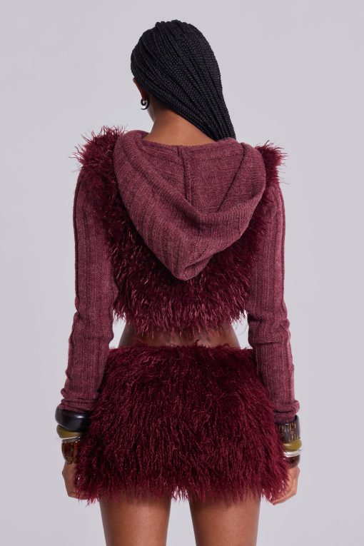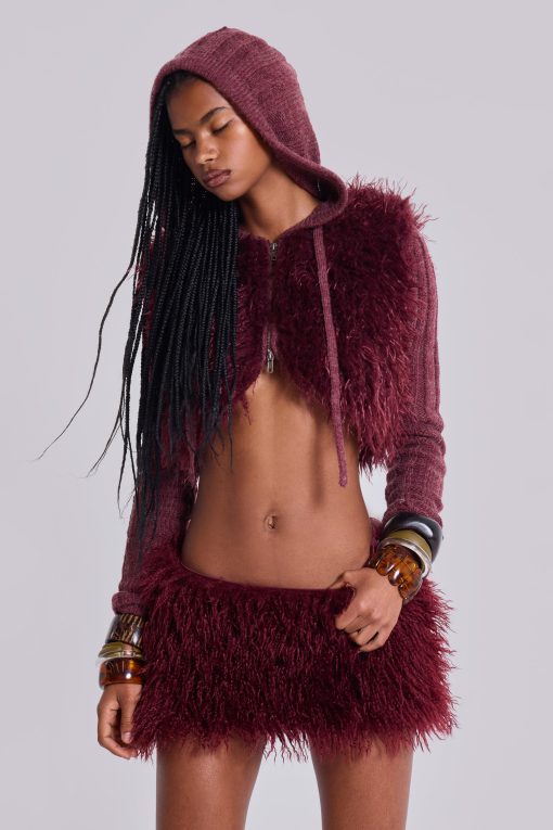 Haka Mongolian Faux Fur Knit Shrug in Wine. Hooded rib knit cropped shrug with Mongolian faux fur body in burgundy. Fastens with zip.