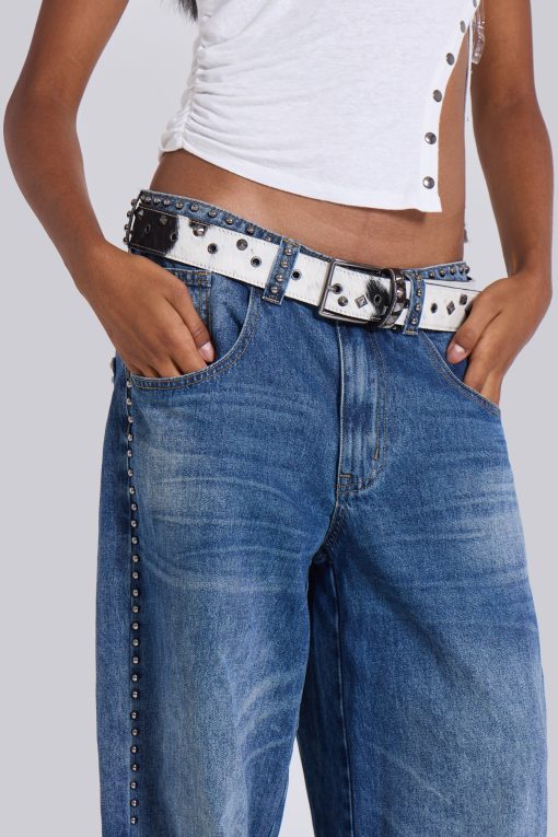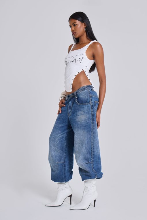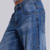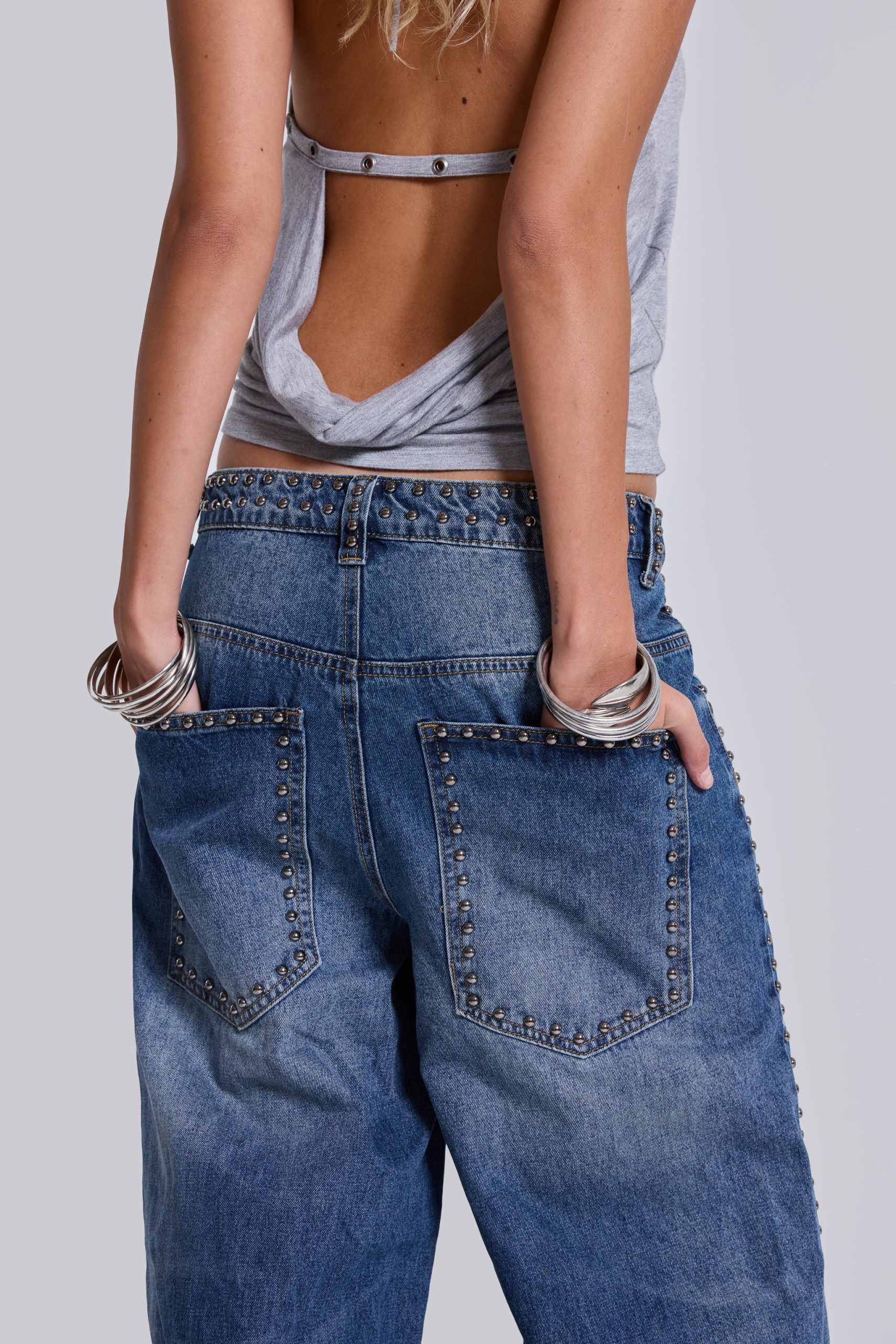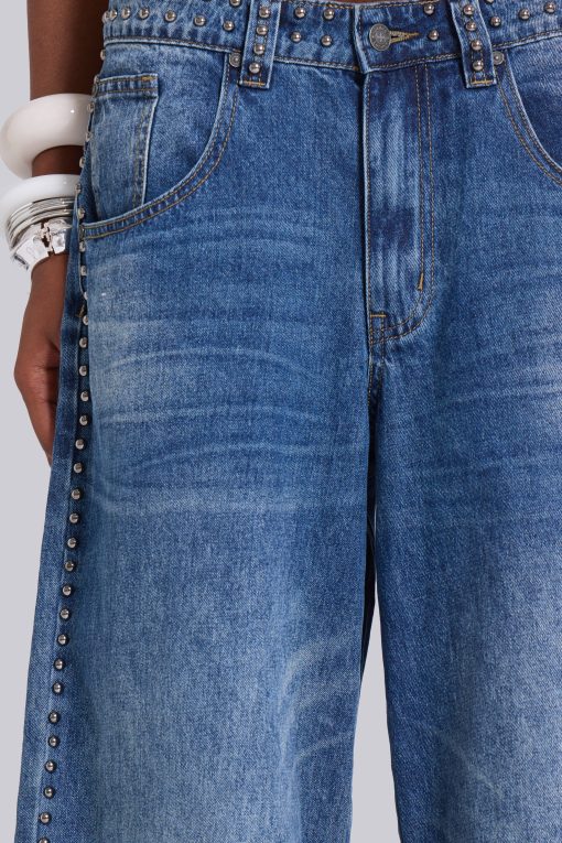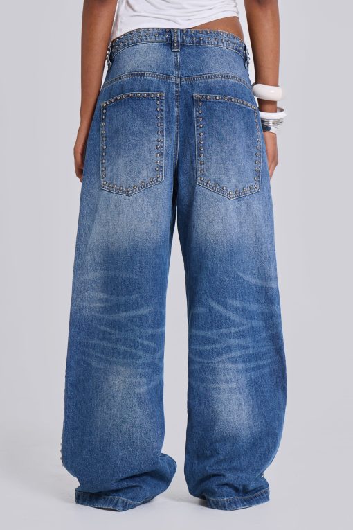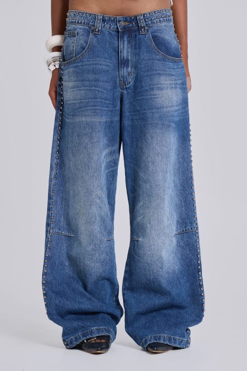 DescriptionNailed Studded Colossus Jeans in Vintage Blue Wash. These mid blue wash Colossus jeans have been designed in an oversized skate fit, enhance by it’s low-rise Colossus fit. Upgraded with gunmetal dome stud details at the side seams, belt loops, waistband and pockets. Crafted from heavyweight denim delivering an unparalleled balance of comfort and timeless style.