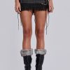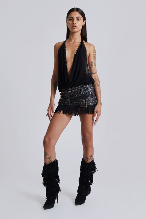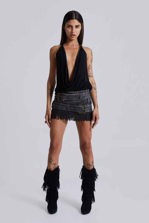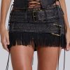 Faux leather mini skirt with belt details and Faux Suede fringing.