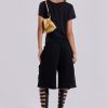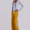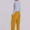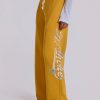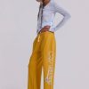 The cropped, cut off yellow joggers are crafted from a loopback fabric, with an elasticated draw cord waistband. They feature a printed slogan down left leg.
