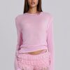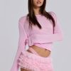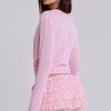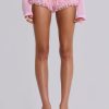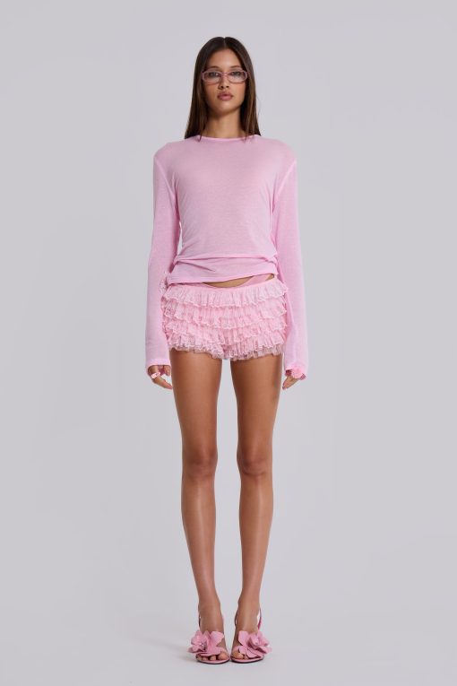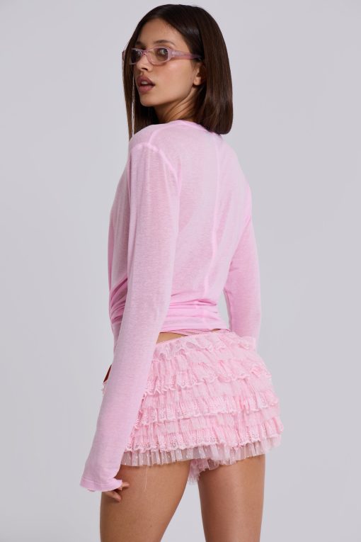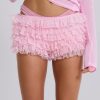 Pink tulle lace mini short bloomers in dobby tulle and lace fabric. These lightweight shorts are adorned with double layer ruffle frills, a scalloped elasticated waistband with decorative bow and pink jersey lining.