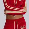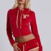 DescriptionThree Velour Fitted Hoodie. Vintage red sporty zip-through hoodie in soft-touch velour with cream applique sleeve stripes, drawcord and distressed embroidered logo detail.