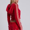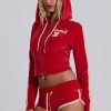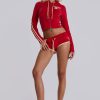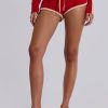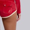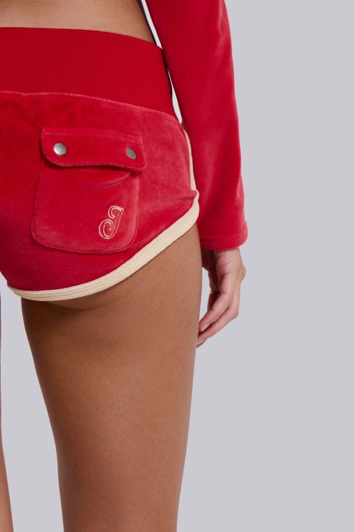 DescriptionThree Velour Mini Runner Shorts. Vintage red sporty low-rise runner shorts in soft-touch velour with a rib waistband, contrast cream edge binding, back pockets with poppers and embroidered branding.