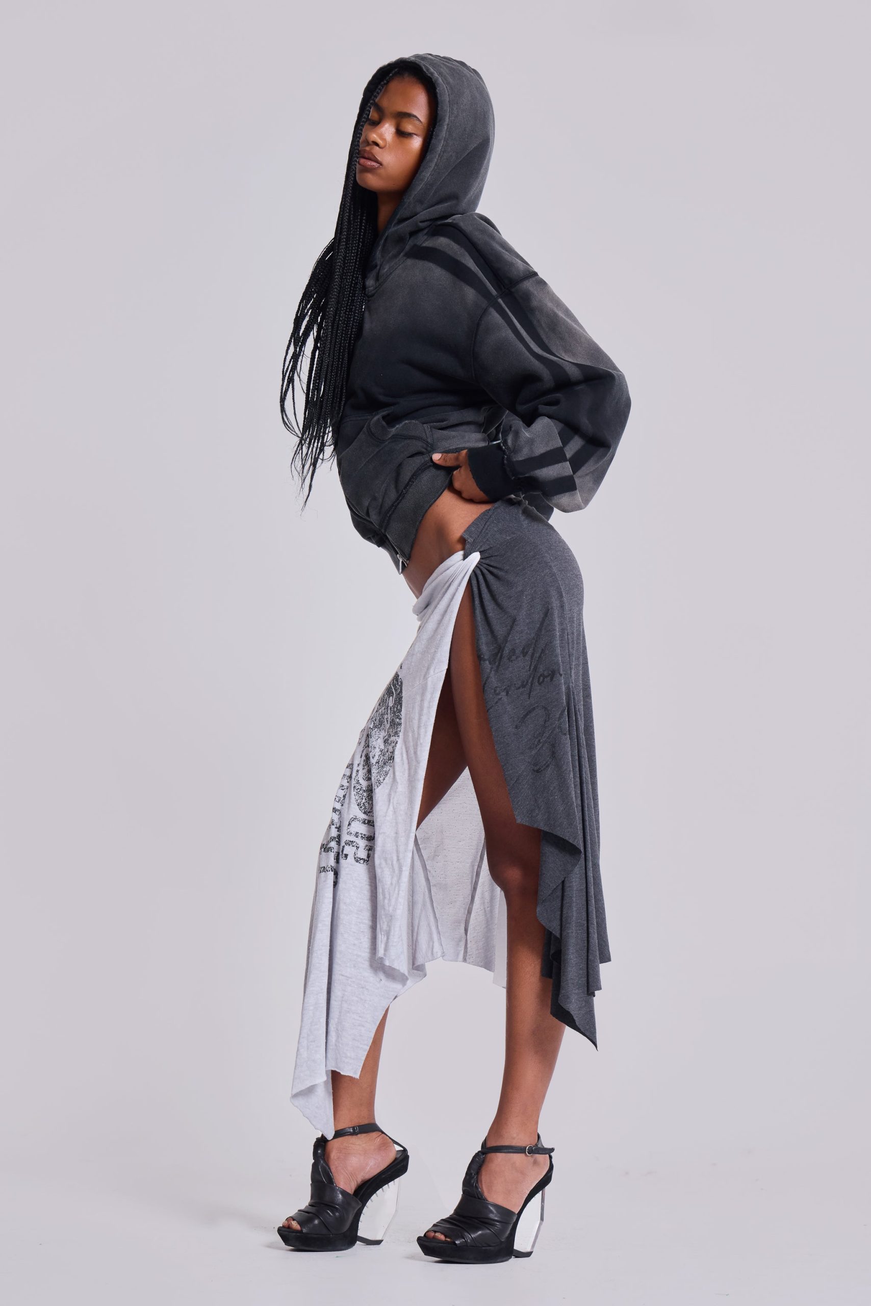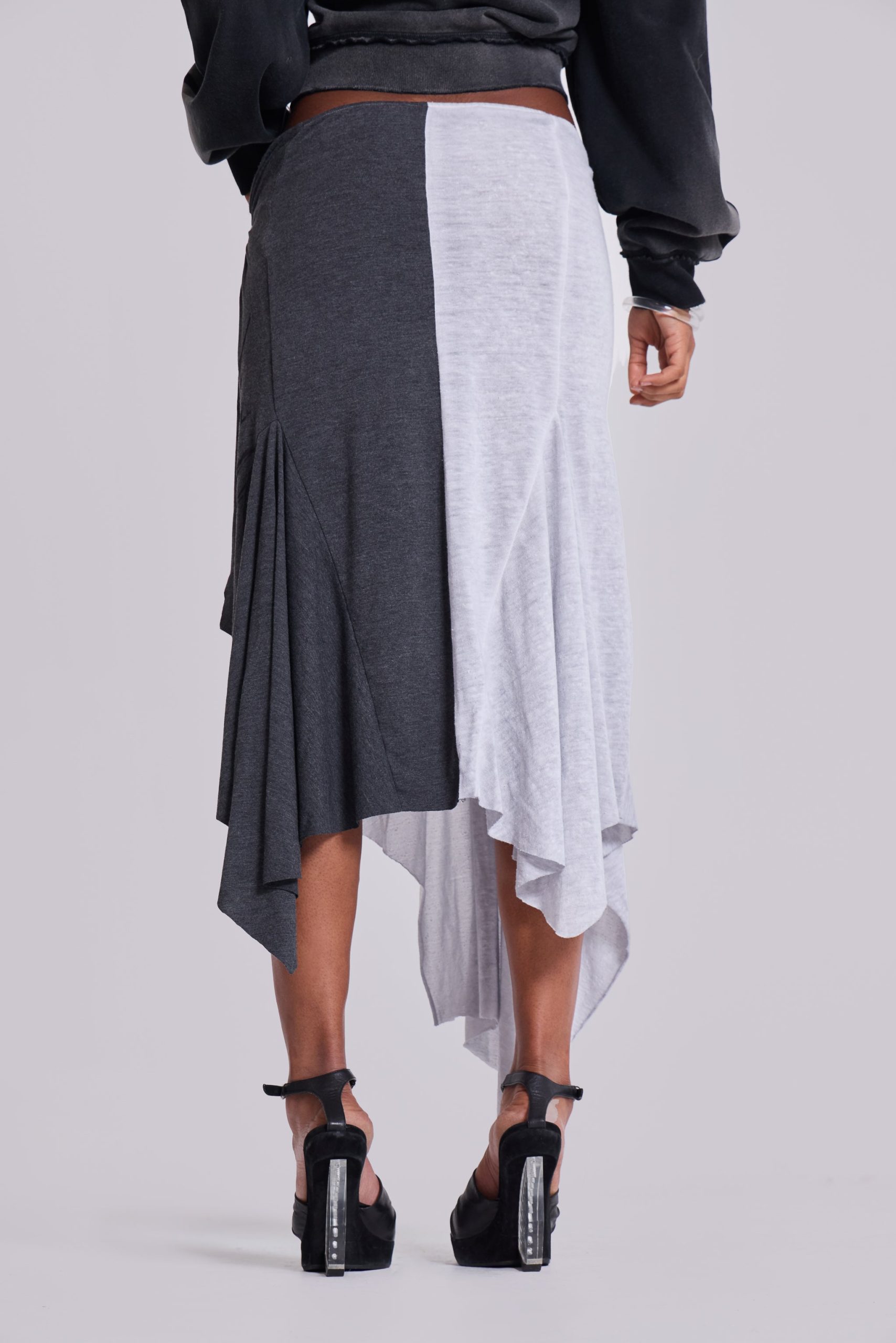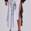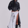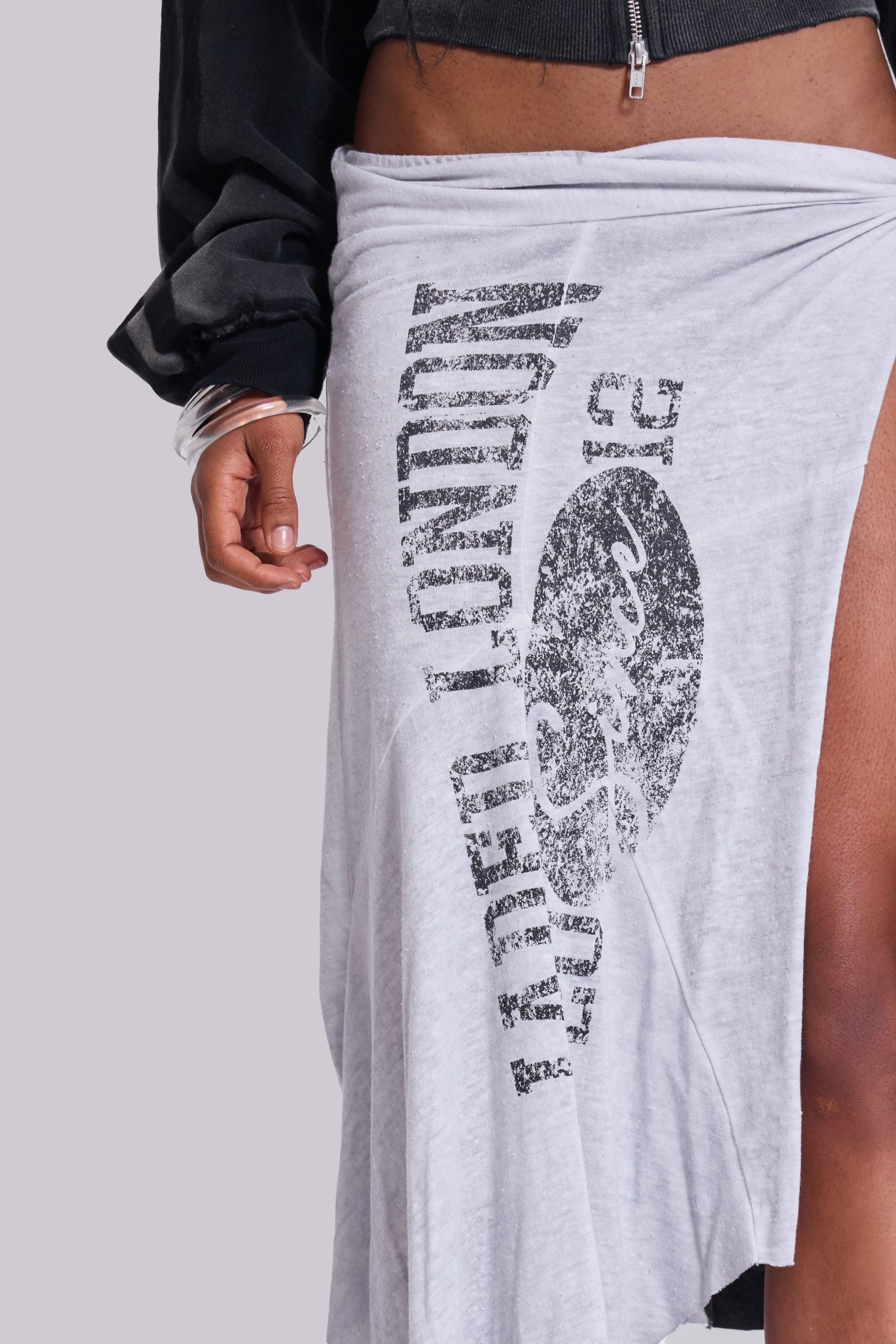 Sasha Asymmetric T-Shirt Midi Skirt. Twisted reworked wrap jersey skirt with distressed artworks.