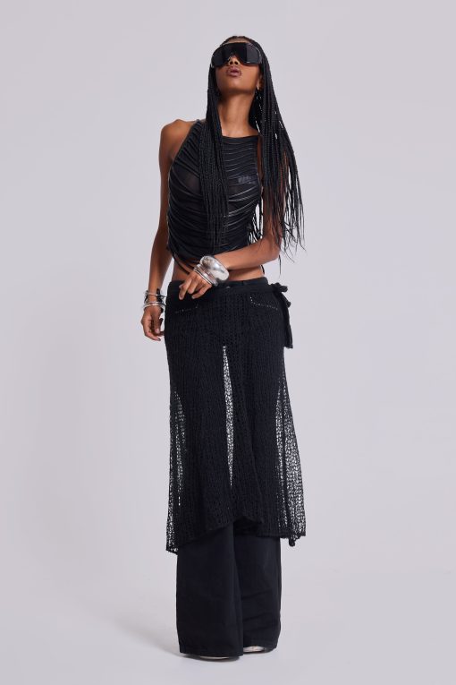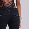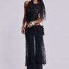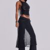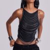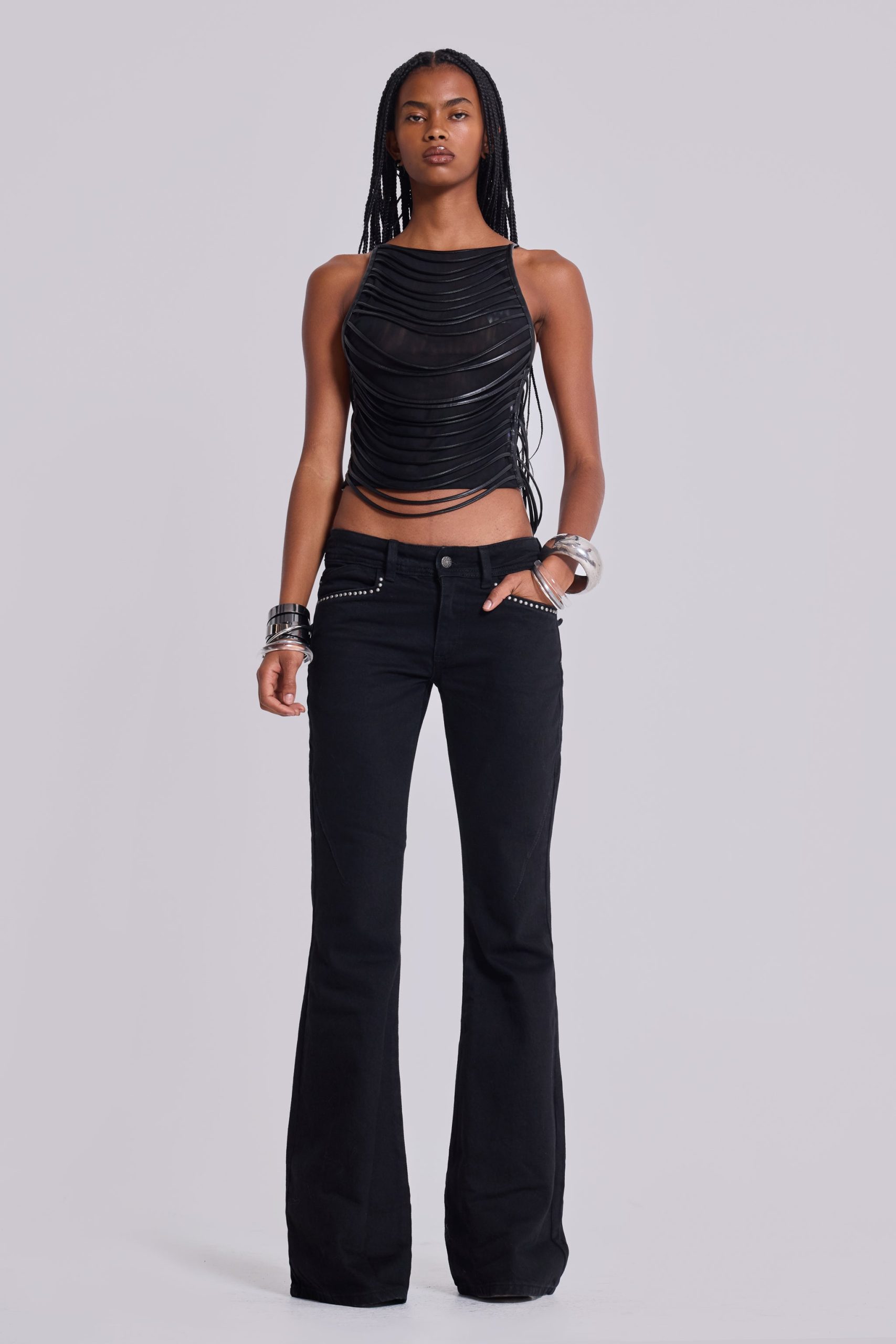 Strings Attached Backless Top. Backless black mesh top with PU faux leather strap detail. Features illusion clear invisible adjustable back straps.