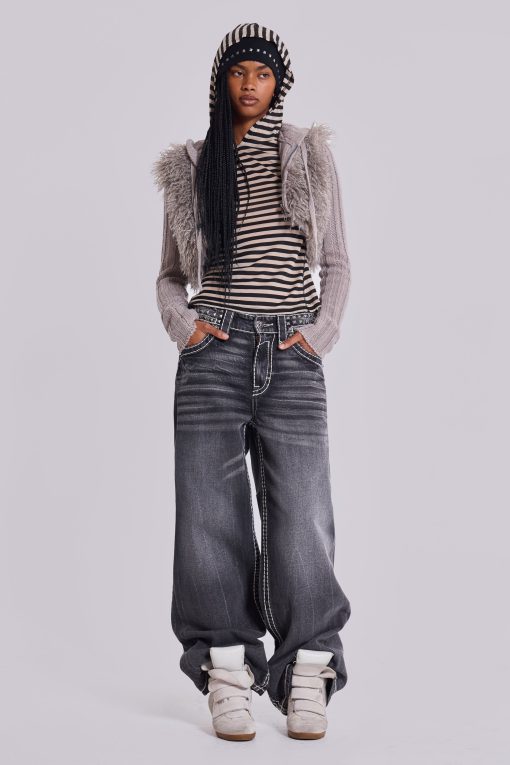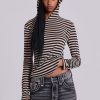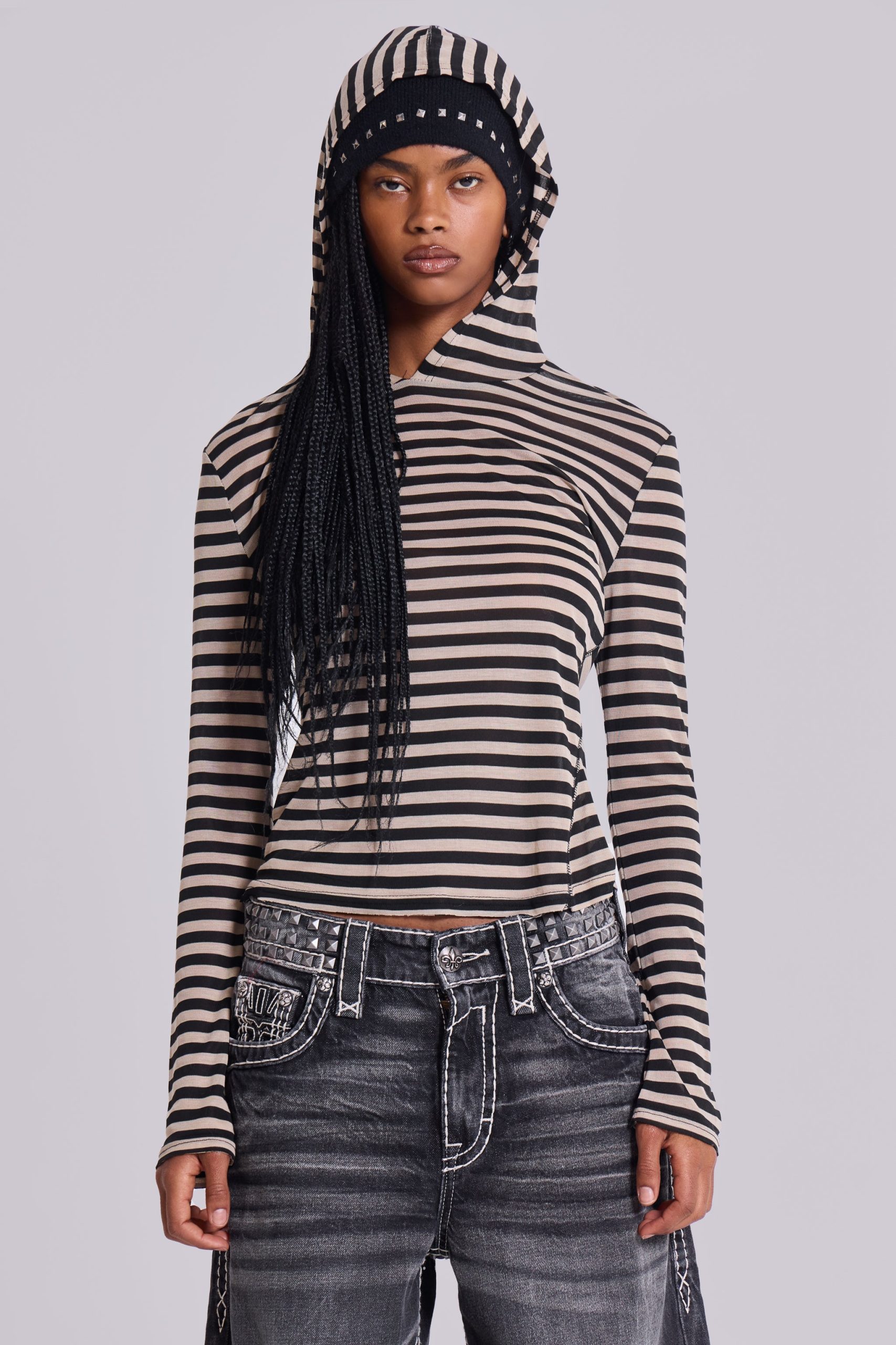 Stripe Mist Hoodie. A sheer lightweight jersey hooded top with beige and black stripe.