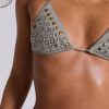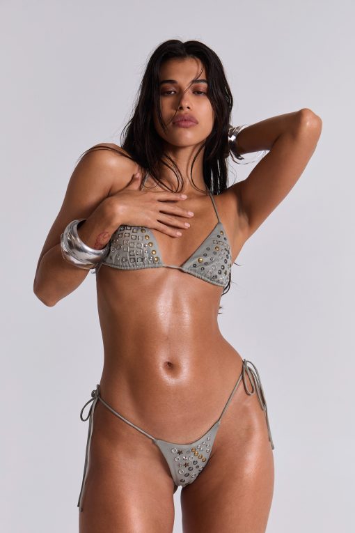 Metal studs may tarnish with washing and wear. Trim not removable.