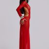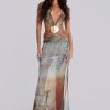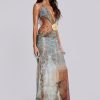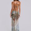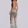 Printed plunge maxi dress which features real shell trim and beaded hip chains.