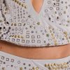DescriptionXtal Studded Backless Plunge Top. Multi studded halterneck tie plunge top.